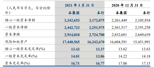 在资本充足方面,今年一季度,建设银行的资本充足指标仍延续下降态势。截至2021年3月31日,该行资本充足率为16.71%,一级资本充足率为14.01%,核心一级资本充足率为13.43%,相比2020年年末,分别下降了0.35个百分点、0.21个百分点、0.19个百分点。在此之前,2020年年末,该行三大资本充足率指标均已较2019年年末下行。