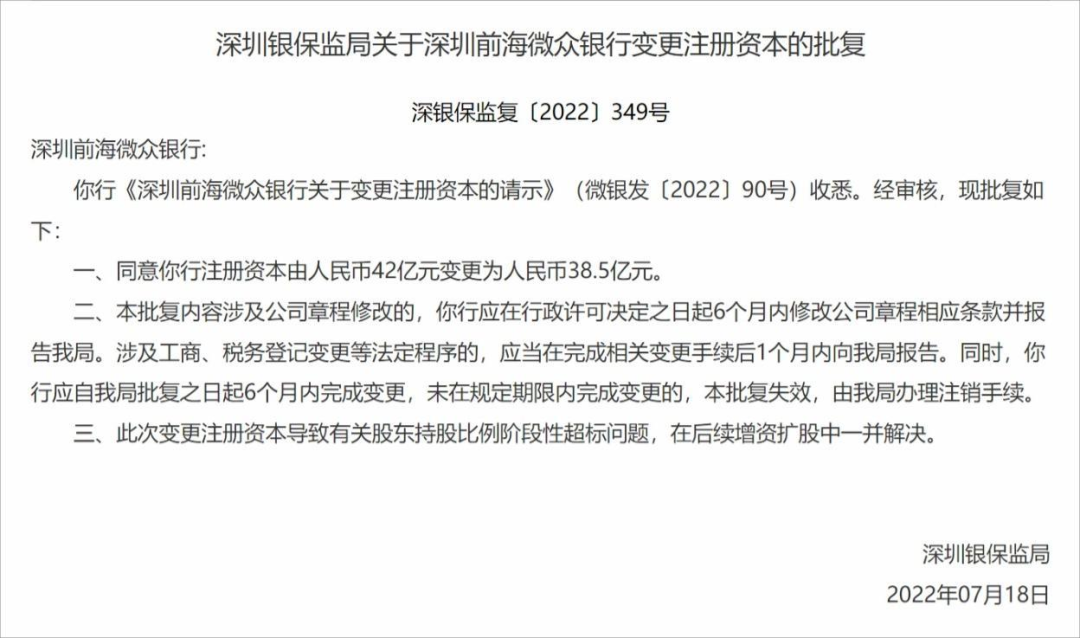 据银保监会官网信息,7月18日,深圳银保监局批复同意微众银行注册资本由42亿元变更为38.5亿元。