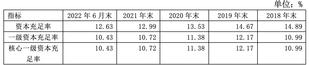 2022年6月末,苏农银行的资本充足率为12.63%,较2021年末下降0.36个百分点,较2018年末下降2.36个百分点。核心一级资本充足率为10.43%,较2021年末下降0.29个百分点,较2018年末下降0.56个百分点。