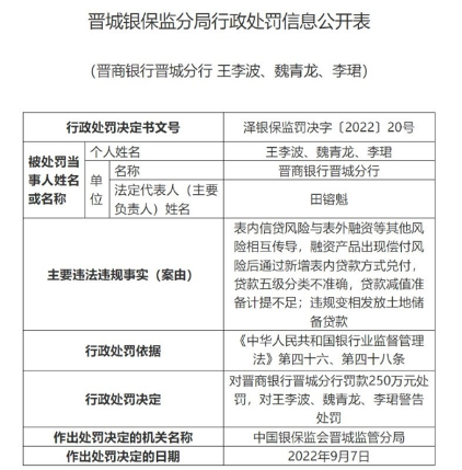 9月7日,银保监会晋城监管分局决定对晋商银行晋城分行罚款250万元。主要原因为:表内信贷风险与表外融资等其他风险相互传导,融资产品出现偿付风险后通过新增表内贷款方式兑付,贷款五级分类不准确,贷款减值准备计提不足;违规变相发放土地储备贷款。
