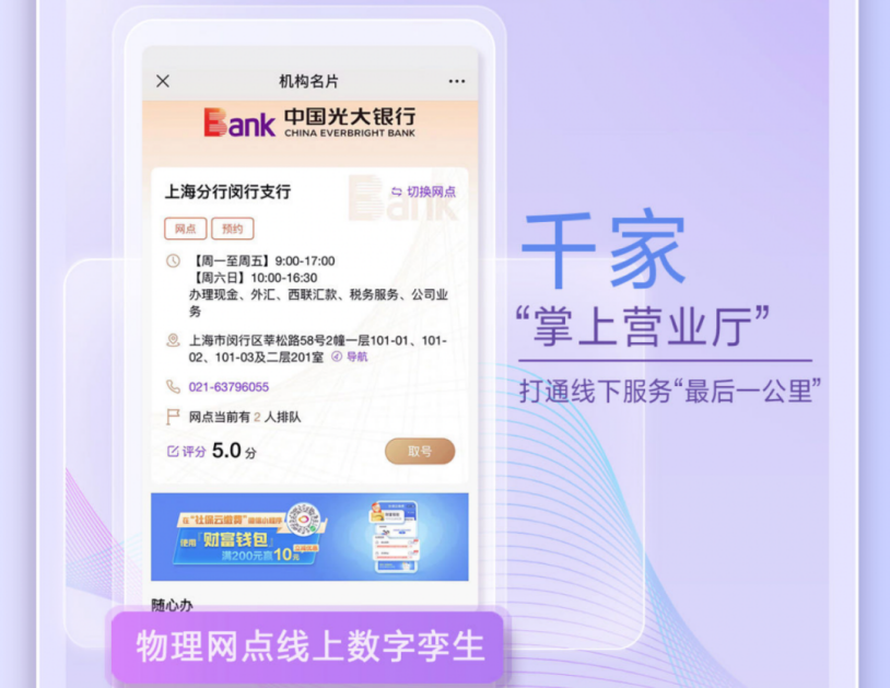 作为一家股份行,从网点数量和覆盖面看,无法与工行、邮储等国有大行去比较,怎么来去弥补这方面的差距?光大银行在业界创新推出千家“掌上营业厅”,打造“物理网点在线上的数字孪生”,把分支行“开”到合作伙伴的生态场景中,为客户打通社区、校园、异地代发等多类场景线下服务的“最后一公里”。