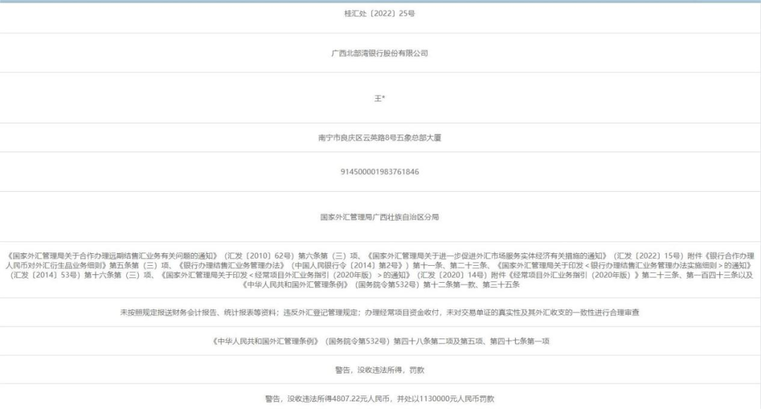 国家外汇管理局官网信息显示,12月7日,国家外汇管理局广西壮族自治区分局决定对北部湾银行警告,没收违法所得0.48万元,并处以113万元罚款。原因包括未按照规定报送财务会计报告、统计报表等资料;违反外汇登记管理规定;办理经常项目资金收付,未对交易单证的真实性及其外汇收支的一致性进行合理审查。