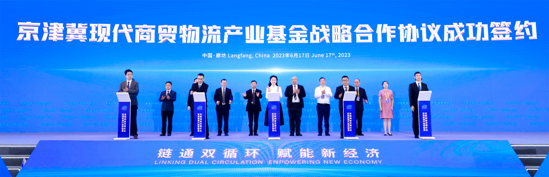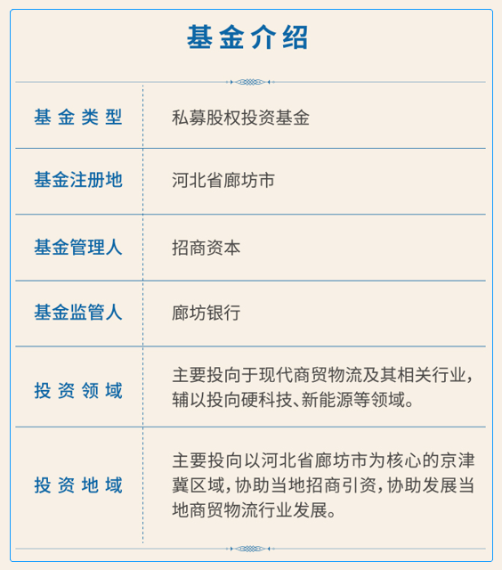 汇聚金融之力,助力京津冀现代商贸物流产业高质量发展。论坛上,京津冀现代商贸物流产业基金正式设立。该基金是在廊坊市政府统筹领导下,由廊坊市财信投资集团、招商资本、廊坊银行发起设立。基金为母子基金交易结构,由廊坊市财信投资集团有限公司设立的廊坊市政府投资引导基金作为母基金,通过引入多层次资本市场融资机制,实现商贸物流产业规模化扩张、便利化服务、智能化提升,从而加速培育区域亿级企业,做优“百亿级”行业,打造“千亿级”产业,加快推进商贸物流中心城市建设,进一步巩固廊坊市重要商贸物流枢纽地位。京津冀现代商贸物流产业基金管理人为招商资本,基金监管人为廊坊银行,主要投向以河北省廊坊市为核心的京津冀区域,协助当地招商引资,助力当地商贸物流行业发展。基金一期规模10亿元,拟投资中国外运股份有限公司及临空经济区,配合临空经济区规划打造高效的经济产业链条。