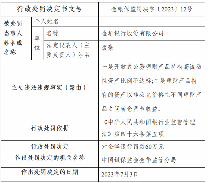 根据7月7日披露的中国银保监会金华监管分局行政处罚信息公开表,金华银行被罚款60万元,因存在两项违法违规事实:一是开放式公募理财产品持有高流动性资产比例不达标;二是理财产品持有的资产以非公允价格在不同理财产品之间转仓调节收益。