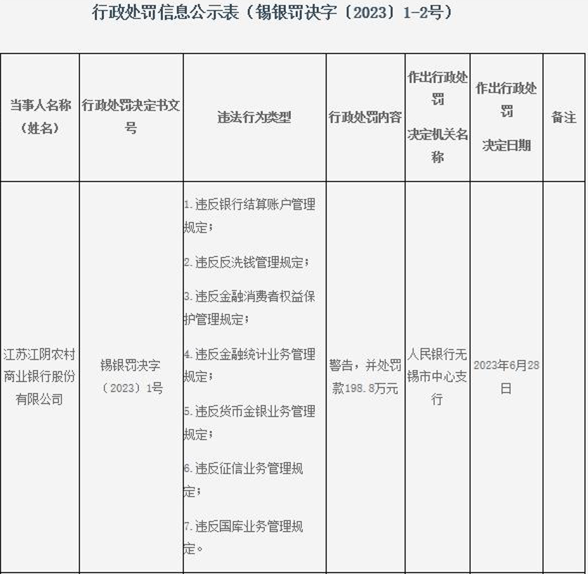 7月6日,中国人民银行网站发布的行政处罚信息显示,6月28日,江阴银行被人民银行无锡市中心支行警告并处罚款198.8万元。