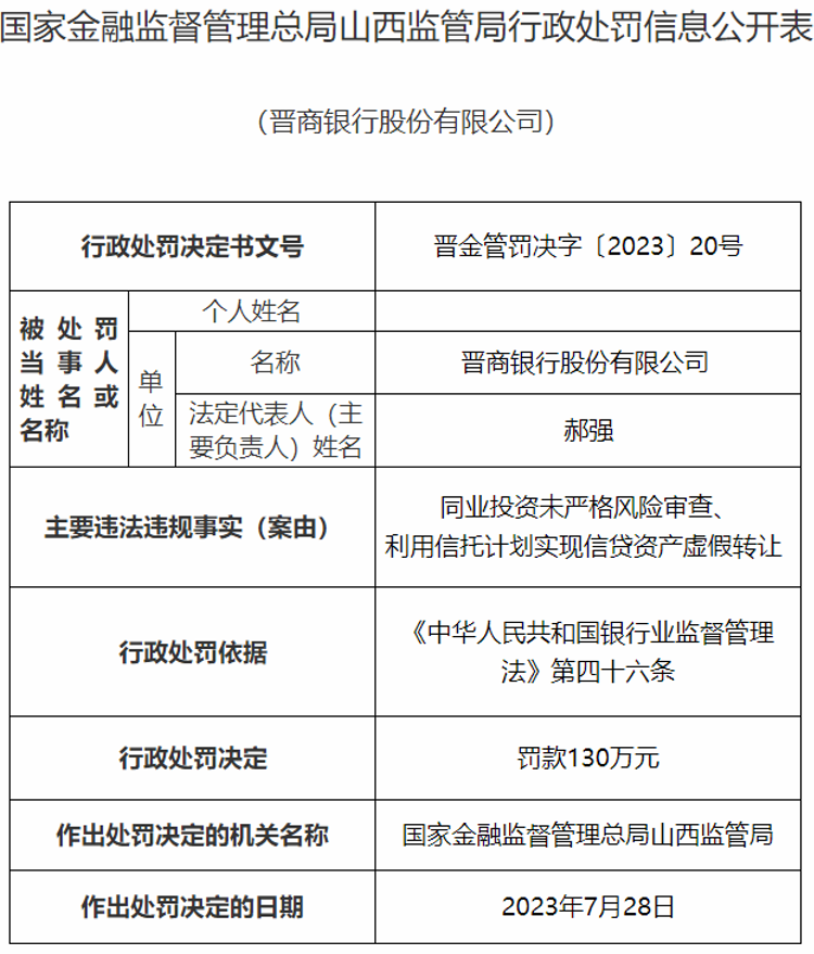 7月28日,国家金融监督管理总局山西监管局决定对晋商银行罚款130万元,主要因同业投资未严格风险审查、利用信托计划实现信贷资产虚假转让。