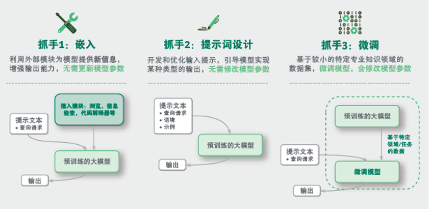 第二,在BCG看来,当前市场通用的生成式AI模型具备普适、跨行业通用、模糊语言的特性,而这难以满足银行业对金融专业能力、精准性方面的高要求。如何让生成式AI模型“说真话”“说专业的话”,是银行业规模化应用生成式AI的两个关键挑战。对此,BCG认为,要巧用方法,利用嵌入、提示词设计、微调三大抓手,让AI生成的答案更专业、实事求是。