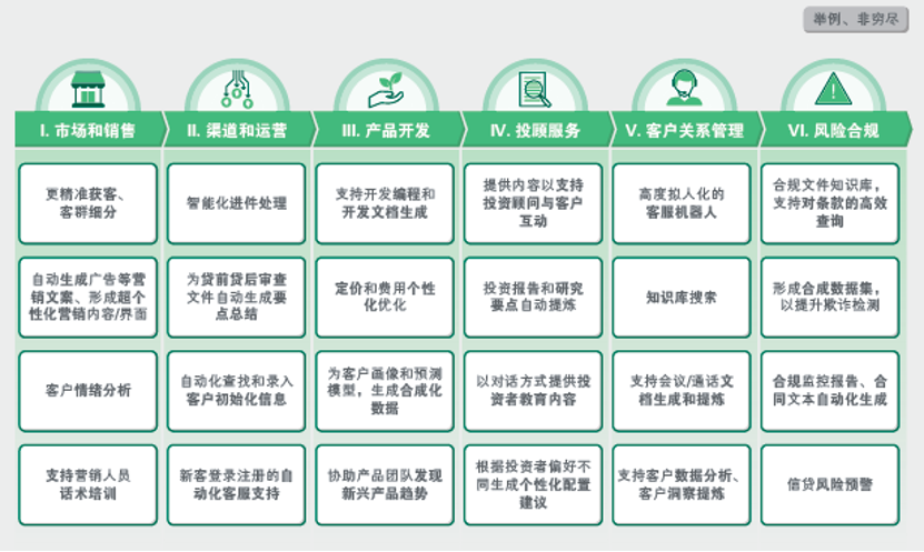 例如,在市场和销售条线,应用生成式AI可以更精准获客、进行客群细分,可以自动生成广告等营销文案、形成超个性化营销内容或界面,还可以进行客户情绪分析,支持营销人员话术培训;在投顾服务条线,可以提供内容以支持投资顾问与客户互动,可以进行投资报告和研究要点自动提炼,也可以以对话方式提供投资者教育内容,或根据投资者偏好不同生成个性化配置建议;在风险合规条线,能够生成合规文件知识库以支持对条款的高效查询,形成合成数据集以提升欺诈检测,自动化生成合规监控报告、合同文本,能够进行信贷风险预警;等等。