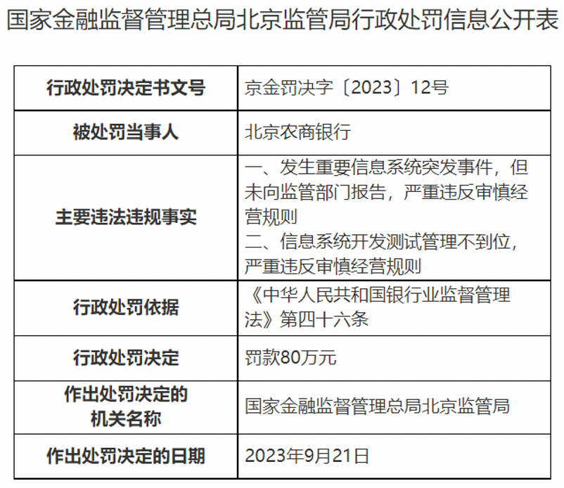 国家金融监督管理总局官网信息显示,9月21日,国家金融监督管理总局北京监管局决定对北京农商行罚款80万元,主要原因是该行发生重要信息系统突发事件但未向监管部门报告,信息系统开发测试管理不到位,严重违反审慎经营规则。