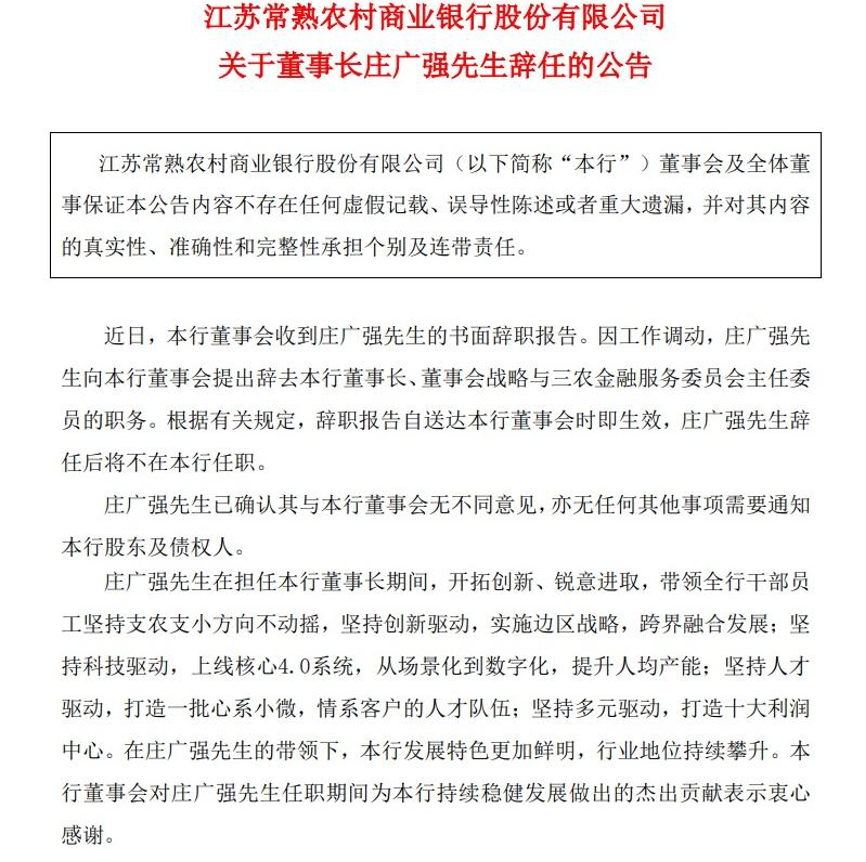 11月13日,常熟银行公告,近日该行董事会收到庄广强的书面辞职报告。因工作调动,庄广强提出辞去董事长等职务。根据有关规定,辞职报告自送达董事会时即生效,庄广强辞任后将不在该行任职。