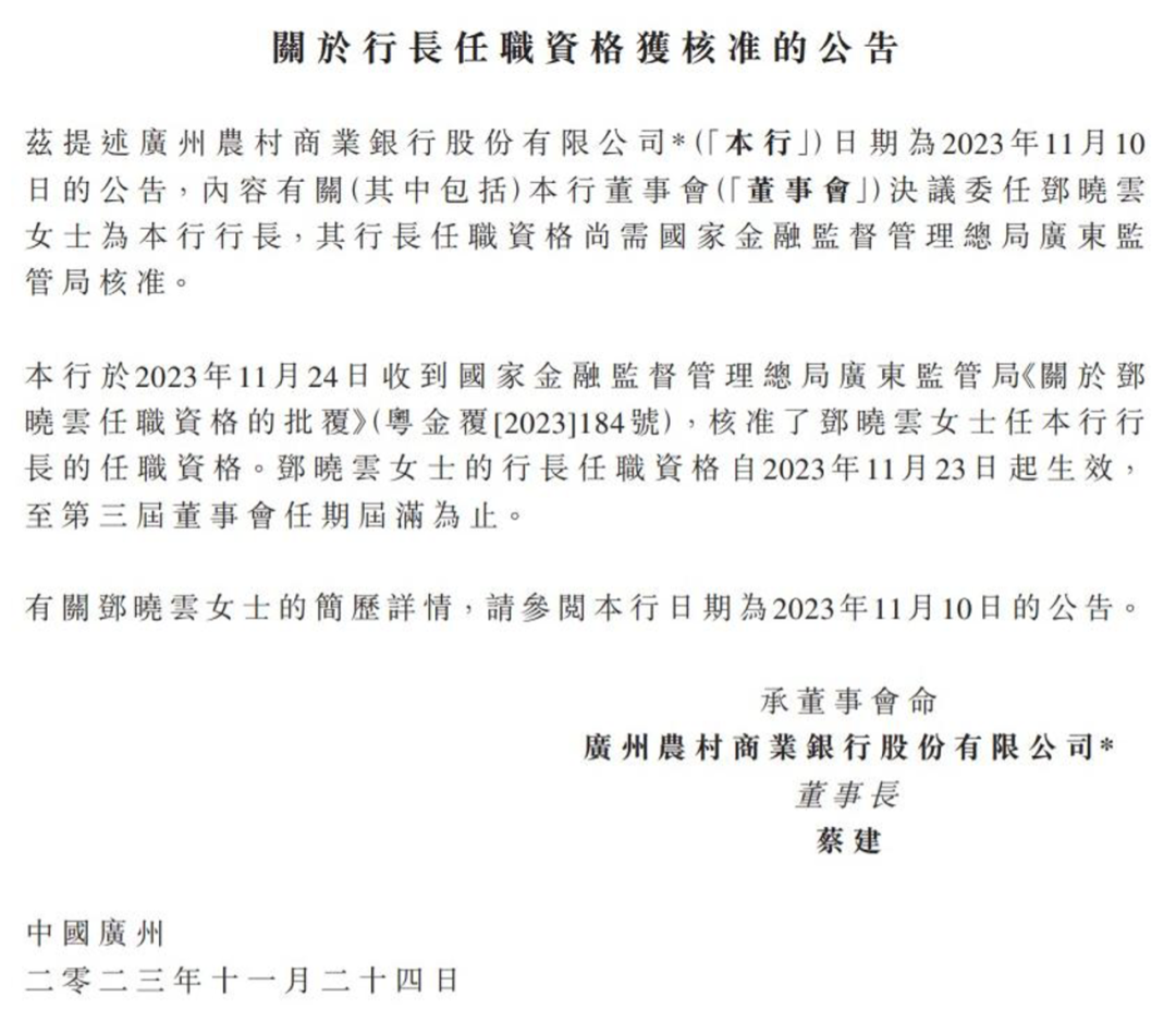 11月24日,广州农商银行公告,该行于当日收到国家金融监督管理总局广东监管局《关于邓晓云任职资格的批复》,核准了邓晓云任该行行长的任职资格。该任职资格自2023年11月23日起生效,至第三届董事会任期届满为止。