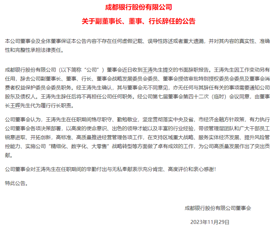 11月29日,成都银行发布公告称,该行董事会近日收到王涛提交的书面辞职报告。王涛因工作变动另有任用,辞去该行副董事长、董事、行长、董事会战略发展委员会委员、董事会授信审批特别授权委员会委员及董事会消费者权益保护委员会委员职务。王涛辞任后将不再担任该行任何职务。经该行董事会会议同意,由董事长王晖代为履行行长职责。
