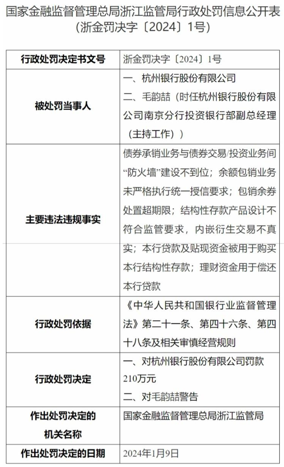 据国家金融监督管理总局官网信息,2024年1月9日,杭州银行从国家金融监督管理总局浙江监管局领到了该局2024年1号罚单。国家金融监督管理总局浙江监管局决定对杭州银行罚款210万元,主要原因包括:债券承销业务与债券交易/投资业务间“防火墙”建设不到位;余额包销业务未严格执行统一授信要求;包销余券处置超期限;结构性存款产品设计不符合监管要求,内嵌衍生交易不真实等。