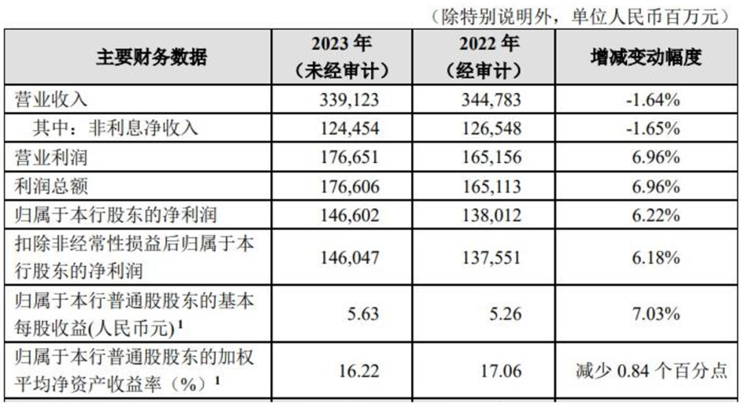 据招商银行2023年度业绩快报,2023年,招商银行归属于本行股东的净利润为1466.02亿元,同比增长6.22%,高于同期商业银行3.24%的净利润同比增速。不过,营业收入为3391.23亿元,同比降1.64%。