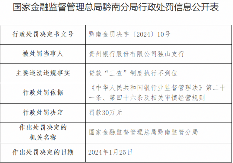 同日,金融监管总局黔南监管分局还决定对贵州银行独山支行和荔波支行分别罚款30万元,分别因贷款“三查”制度执行不到位、要求借款人以存放一定资金为条件匹配发放贷款。