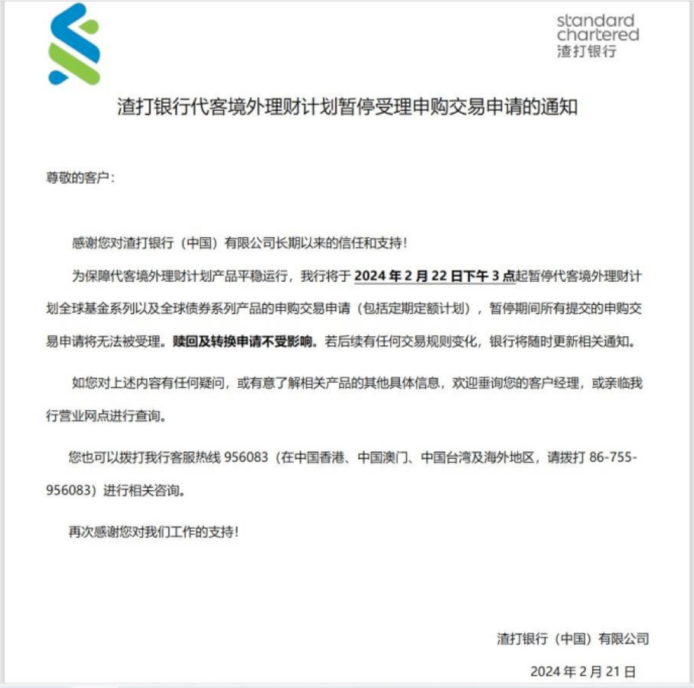 2024年2月21日,渣打银行官网发布《渣打银行代客境外理财计划暂停受理申购交易申请的通知》。该通知称,为保障代客境外理财计划产品平稳运行,该行将于 2024年2月22日下午3点起暂停代客境外理财计划全球基金系列以及全球债券系列产品的申购交易申请(包括定期定额计划),暂停期间所有提交的申购交易申请将无法被受理。赎回及转换申请不受影响。若后续有任何交易规则变化,该行将随时更新相关通知。