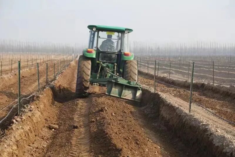 工人清理土壤,将掩埋一冬的葡萄藤翻出,为扶藤做准备。