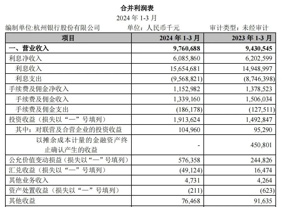 2023年,杭州银行营业收入同比增6.33%,归属于上市公司股东的净利润同比增23.15%,但手续费及佣金净收入同比下降13.5%,净利息收益率同比下降0.19个百分点