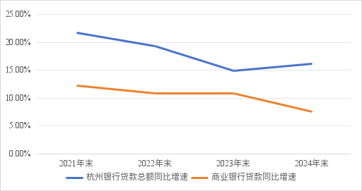 今年一季度末,杭州银行贷款总额较上年末增长6.15%,略高于同期商业贷款增速。2021年—2024年,该行贷款总额同比呈现持续较高增长,且高出商业银行贷款同比增速较多。