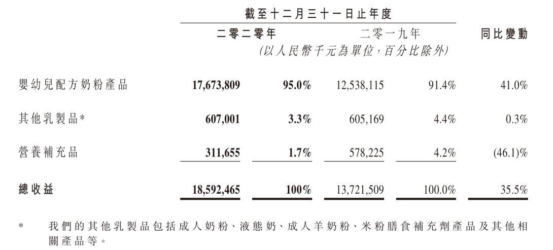 飞鹤2020年产品按产品类别划分的收益情况