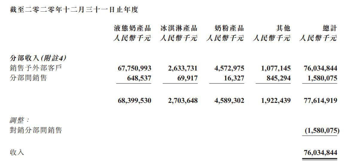 而2019年,其液态奶、冰淇淋、奶粉和其他业务分别实现收入678.78亿元、25.61亿元、78.70亿元和7.21亿元,占当期总营收的比例分别为85.89%、3.24%、9.96%和0.91%。