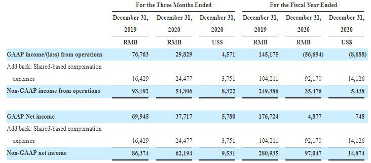 新氧2020年第四季度和全年GAAP和非GAAP指标