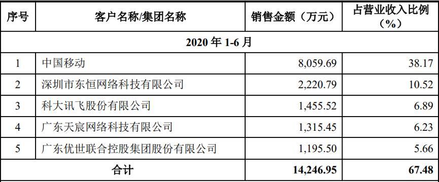 报告期内,该公司来自前五大客户的销售金额分别为1.2亿元、1.14亿元、2.3亿元和1.42亿元,占当期营业收入的比例分别为32.84%、39.04%、54.42%和67.48%,集中度逐年增加。其中,来自中国移动的收入占比分别为10.65%、16.50%、26.90%及38.17%,前者亦为蜂助手第一大客户。