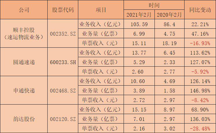 顺丰、圆通、申通和韵达2021年2月业务经营情况