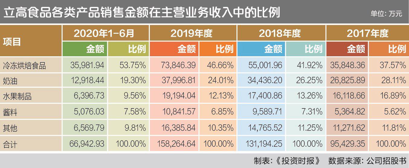 立高食品主要从事烘焙食品原料及冷冻烘焙食品的研发、生产和销售。其主要产品包括奶油、水果制品、酱料、巧克力等烘焙食品原料和冷冻烘焙半成品及成品,此外还生产部分休闲食品。