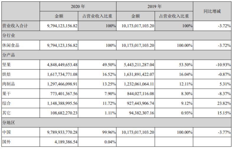 分产品来看,坚果产品全年实现营收48.48亿元,同比下滑10.93%,对公司营收的贡献率高达49.50%,不过仍较上年同期53.50%的营收贡献率有所降低。该公司将坚果产品收入的减少解释为2020年线上流量进一步去中心化,作为核心品类的坚果产品引流效果开始减弱,销售占比出现下滑。