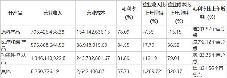 再对比原料产品板块与功能性护肤品板块的毛利率,2020年,两大业务板块的毛利率分别为78.09%和81.89%,相差并不大。可以说,功能性护肤品业务的起势略挽回了其于原材料业务方面的损失。