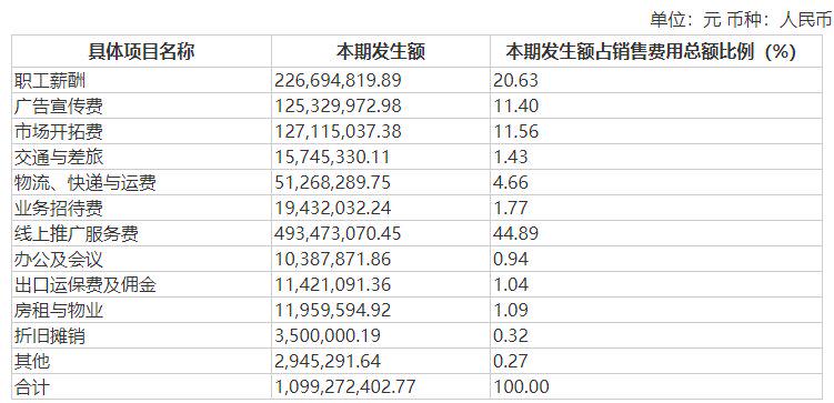 财报显示,2020年华熙生物销售费用达10.99亿元,相较2019年的5.21亿元增长110.84%。这其中,广告宣传费用为1.25亿元,线上推广服务费共计4.93亿元,两者合计6.18亿元,占销售费用比例约56%,对应功能型护肤品收入的品宣和推广服务费用率为45.91%。