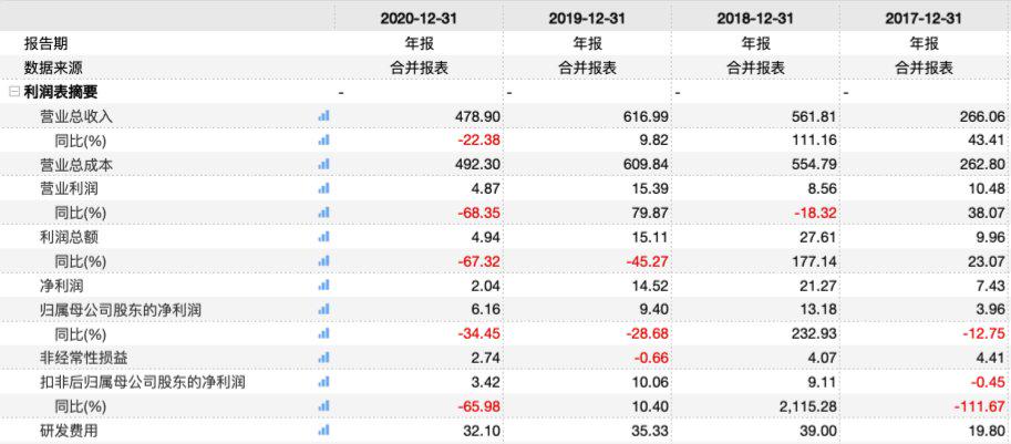 或受疫情冲击,进入2020年,均胜电子陷入营收净利润双降局面。据财报数据披露,该公司2020年营业收入同比下降22.38%至478.90亿元;归母净利润较上一年同期缩水超3亿元,仅有6.16亿元,同比降幅34.45%。