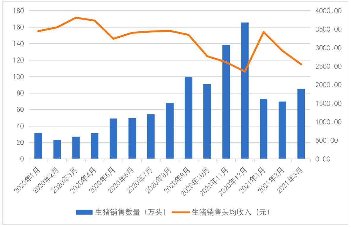 预计净利润大幅下挫的同时,新希望生猪销售头均收入也持续下降。2021年3月该公司生猪头均收入为2554.16元,仅次于2020年12月创下的一年多以来低价