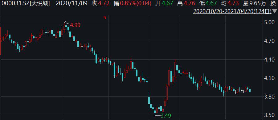 截至2021年4月22日,大悦城股价收盘于3.85元/股(不复权,下同),较2020年的6.49元/股高点下挫四成,总市值165亿元。