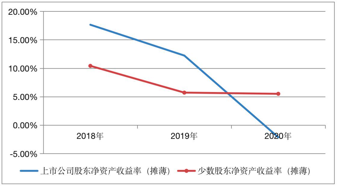 不过,值得注意的是,相对于重组后归母净利首次亏损,其少数股东损益反倒为正,录得15.10亿元,较2019年增长13.76%;少数股东权益为272.95亿元,较上年增长41.65亿元。2020年,该公司少数股东净资产收益率(摊薄)为5.53%,高出上市公司股东的ROE。