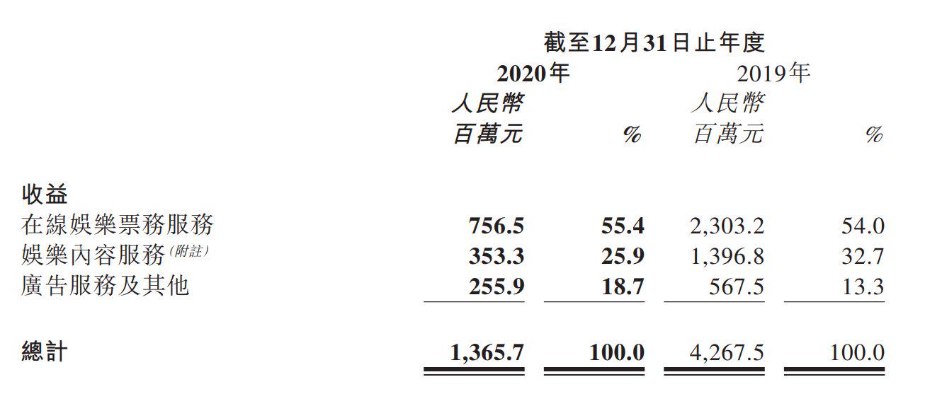 年报显示,其全年收益减少主要受疫情影响,使得在线娱乐票务服务、娱乐内容服务以及广告服务及其他所得收益均同比减少。