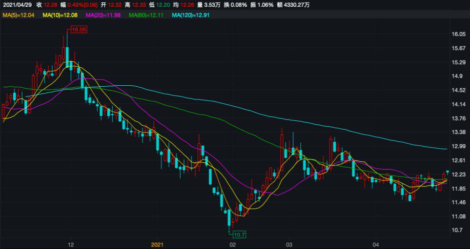 截至2021年4月28日,金地集团收盘于12.22元/股(不复权,下同),较52周高点17.77元/股下挫31%,总市值仅552亿元。