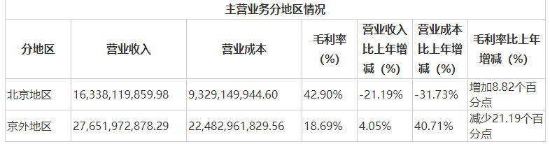 不过从毛利率来看,首开股份北京地区主营业务毛利率更高,为42.90%,且较2019年增加8.82个百分点。京外地区相关业务的毛利率仅为18.69%,同比减少21.19个百分点。
