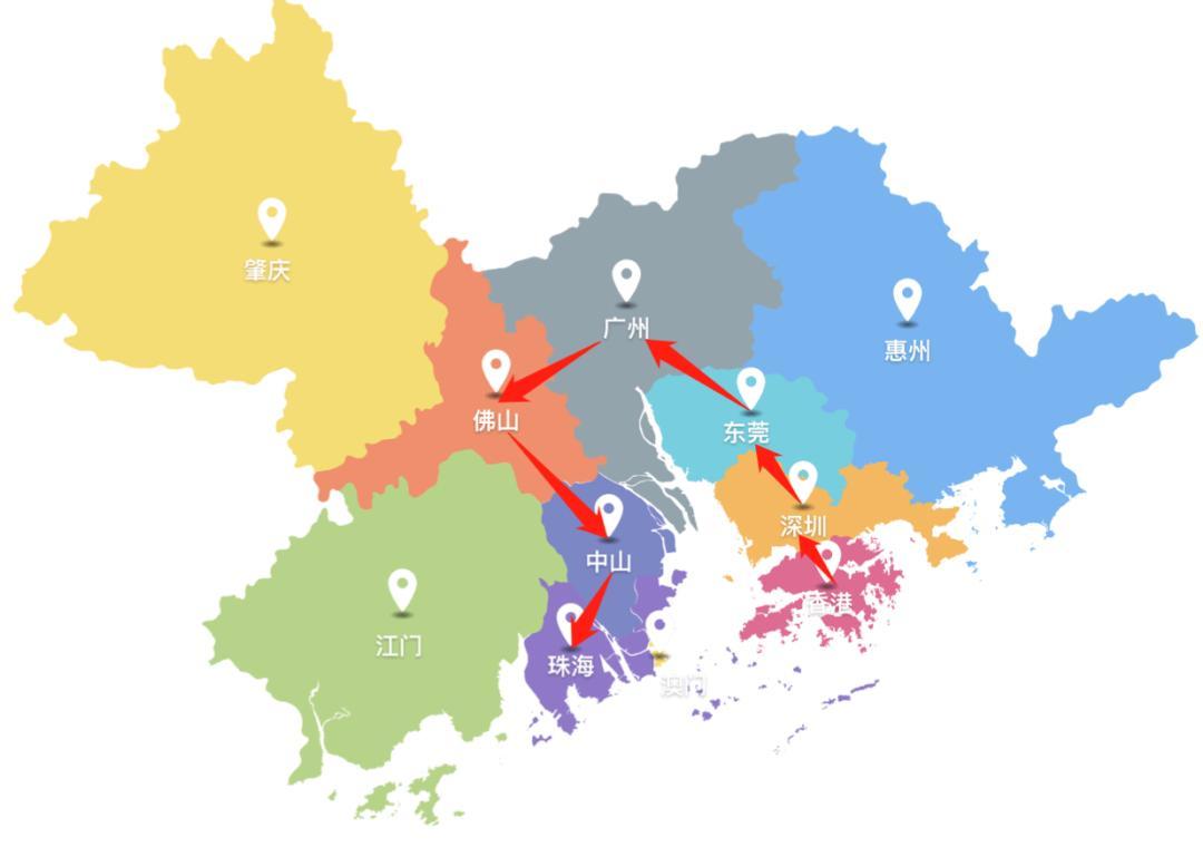凡此种种,致使珠海等珠江西岸城市在过去四十年里不仅处于大湾区的交通末梢,而且在产业承接上也处于大湾区的传播末端,成为大湾区的失乐园。如图中红色箭头所指的路线,过去四十年大湾区的产业传播首先从香港到深圳,然后到东莞、广州、佛山,最后才到珠江西岸的中山、珠海。