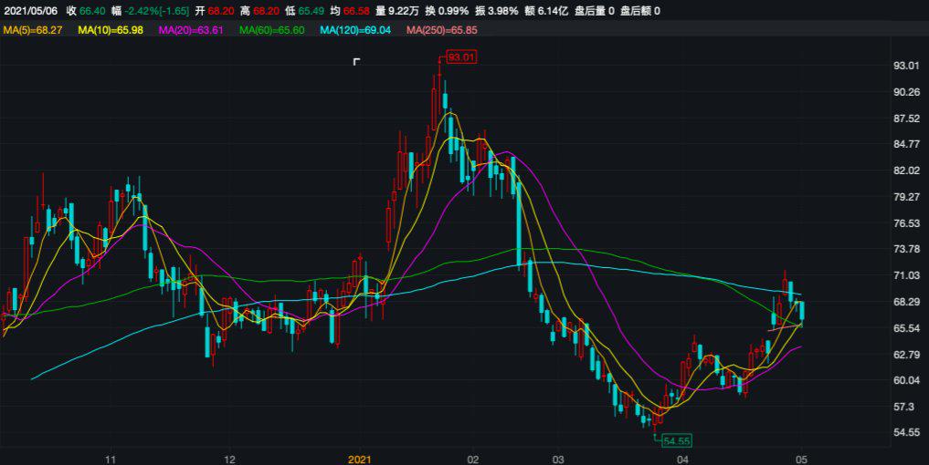 截至2021年5月6日收盘,芒果超媒收于66.4元/股(不复权),连续三个交易日收跌。较年内最高价93.01元/股下挫近28.6%,总市值为1182亿元。