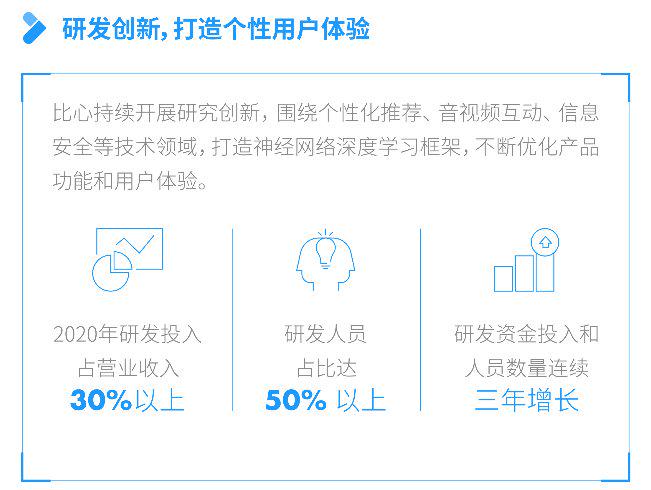 在比心这一样本中,可以清晰地看到数字化能力作为企业核心竞争力要素,已成为企业跨越式增长的重要引擎。比心高度重视研发创新,深度构建了产品研发、商业运营、风控审核、客服系统在内的全体系数字化底层架构。据统计,2020 年比心研发投入占营收比例超过 30% ,研发人员占比过半, 研发资金投入和人员数量连续三年增长。