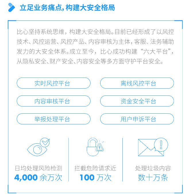比心将“正直”贯穿到风控工作始终,坚决打击各种违反国家法律法规和社会主流价值观的行为,保障平台安全,为用户创造可靠的网络环境。建成了实时风控、离线风控、内容审核、资金安全、举报处理、用户申诉“六大平台”。数据显示,比心日均处理风险检测4,000余万次,拦截危险请求近百万次。截至2020年末,累计拦截超过13万次未成年人陪练资质的认证请求,每天拦截约600次疑似未成年人消费请求。