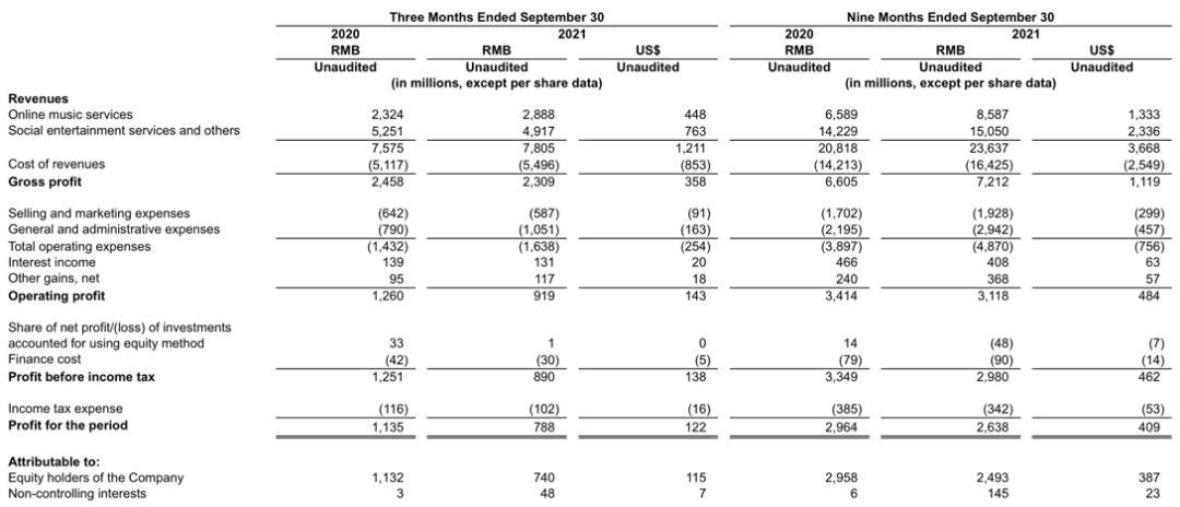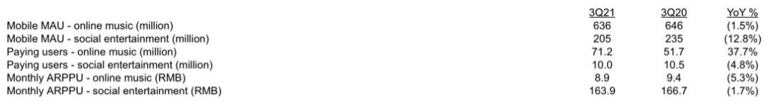 腾讯音乐2021年三季度主要会计数据(百万人民币)