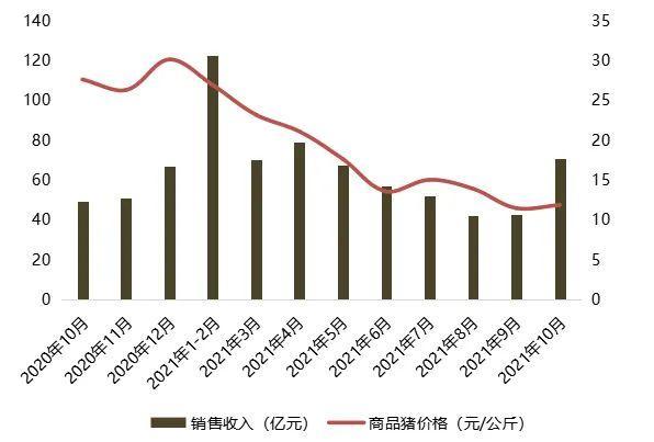 具体到牧原股份,数据显示,自2020年10月至2021年10月,该公司各个月份商品猪价格整体呈现出波动走低的态势,且于2021年5月进入20元/公斤以下的销售区间,并在今年9月触及11.49元/公斤的低点。
