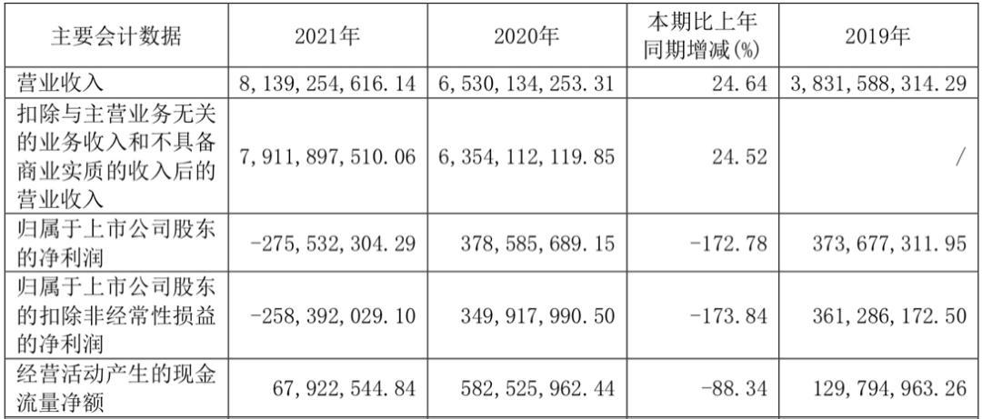 财报数据显示,2021年该公司实现营收81.39亿元,同比增长24.64%,但归属于上市公司股东的净利润却出现亏损,由2020年的3.79亿元降至-2.76亿元,降幅达172.78%。