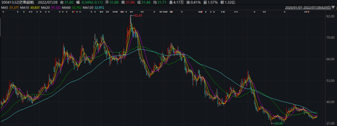 截至7月28日收盘,芒果超媒报收于31.6元/股,较1月4日盘中触达的59.56元/股的年内高点下挫46.94%,当前总市值为591.15亿元。