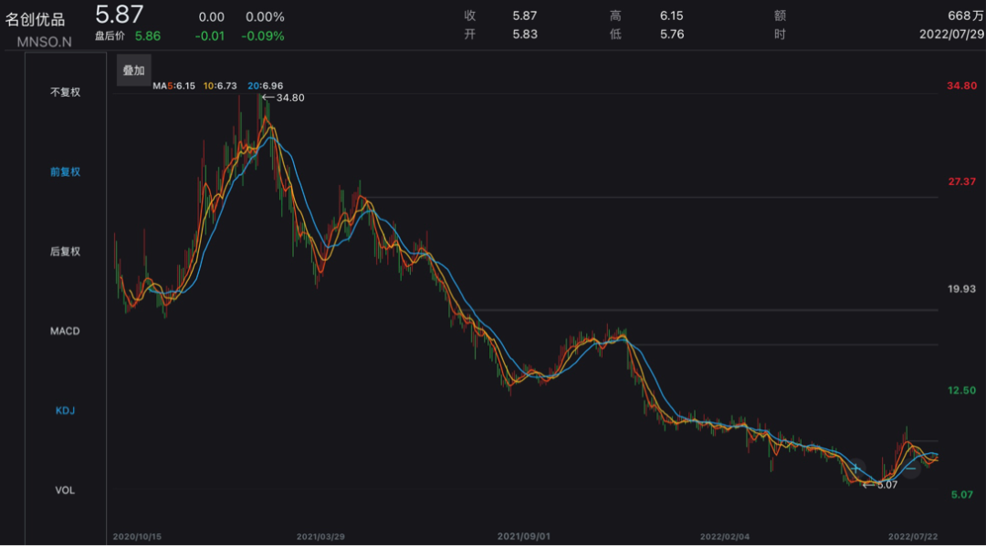 2020年10月,名创优品在美国纽交所挂牌上市。但受疫情影响,名创优品在美股市场自2021年2月创下35.21美元/股历史最高价后,股价一路下跌。在上市不到两年的时间里,股价已累计下跌超80%,市值仅剩18.6亿美元。2022年7月13日,名创优品以双重主要上市形式,在香港交易所挂牌上市。