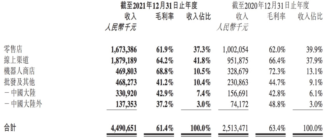 再按渠道划分的收入情况来看,时至2021年,泡泡玛特仍有大部分收入来源于线下渠道,数据披露,2021年全年该公司线上渠道所贡献的收入为18.79亿元,较上年同期增长超九成,不过在总收入中的占比仍不及线下渠道,为41.8%,而同时期该公司零售店和机器人商店所贡献的收入占比合计达47.8%。
