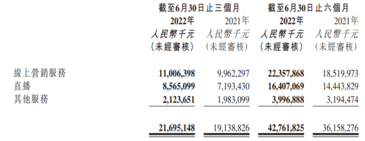 快手的业务包括线上营销服务、直播以及其他服务(包括电商)。数据显示,2022年第二季度,公司在线营销业务贡献收入110.06亿元,同比增长10.5%,增速已较上季度放缓。上半年,该核心业务贡献营收223.58亿元,同比增速仅为20.7%,也远低于上年同期的“三位数”增速。